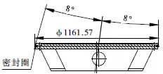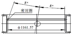 閥體起密封作為的為密封圈,焊接在閥體內(nèi)(圖5)。在2.5m立車上將組焊好的閥體裝夾在閥體密封圈加工工裝上,將立車刀桿旋轉(zhuǎn)8°,根據(jù)圖紙?jiān)O(shè)計(jì)要求,找正后沿圓錐母線方向走刀,車至未焊不銹鋼前的尺寸。然后堆焊不銹鋼,最后將焊好不銹鋼的閥體重新上立車,按上述方法車閥體密封圈至圖紙要求尺寸。最后在立車刀架上裝磨頭,對(duì)閥體密封圈進(jìn)行磨削處理,使其達(dá)到圖紙?jiān)O(shè)計(jì)粗糙度要求。