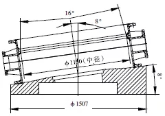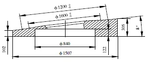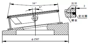 蝶板組合件起密封作用的零件是密封圈,密封圈為斜錐結(jié)構(gòu),其錐頂角為16°,厚度為13.5mm,由5層石棉板及4層不銹鋼板復(fù)合而成(圖6)。密封圈必須與蝶板和壓環(huán)等組裝在一起,加工時(shí)才能防止密封圈夾層中的不銹鋼板及石棉板翹曲變形。根據(jù)其結(jié)構(gòu)特點(diǎn),對(duì)蝶板組合件密封圈采用以下加工方法:(1)先在2.5m立車上分別把蝶板和壓環(huán)上的各止口加工到圖紙要求尺寸,外圓不加工;(2)按圖紙要求對(duì)壓環(huán)鉆孔,蝶板鉆孔攻絲;(3)壓環(huán)、密封圈和蝶板按圖紙裝配,將蝶板組合件工裝用螺栓緊固在閥體工裝上,然后再將蝶板組合件裝夾其上。立車刀桿旋轉(zhuǎn)8°車壓環(huán)、密封圈和蝶板至磨削尺寸;⑷用同樣厚度鋼板替下密封圈,車壓環(huán)、蝶板各錐面至圖紙尺寸;(5)工裝不動(dòng),將壓環(huán)、密封圈、蝶板重新按要求組裝,然后在立車刀架上裝磨頭,對(duì)密封圈進(jìn)行磨削處理,使其達(dá)到圖紙?jiān)O(shè)計(jì)粗糙度要求。